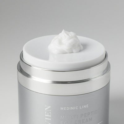 "マルチペプチドリペアクリーム"の主成分14種のペプチドや17種のアミノ酸はそのままに、基材であるナノバブルウォーターを更にナノ化させ、ツボクサ成分やEGFを豊富に含有してアップグレードされた、乱れた肌を基礎から整えて健康的な肌へと導く、しっとりとした生クリームテクスチャーのクリームです。