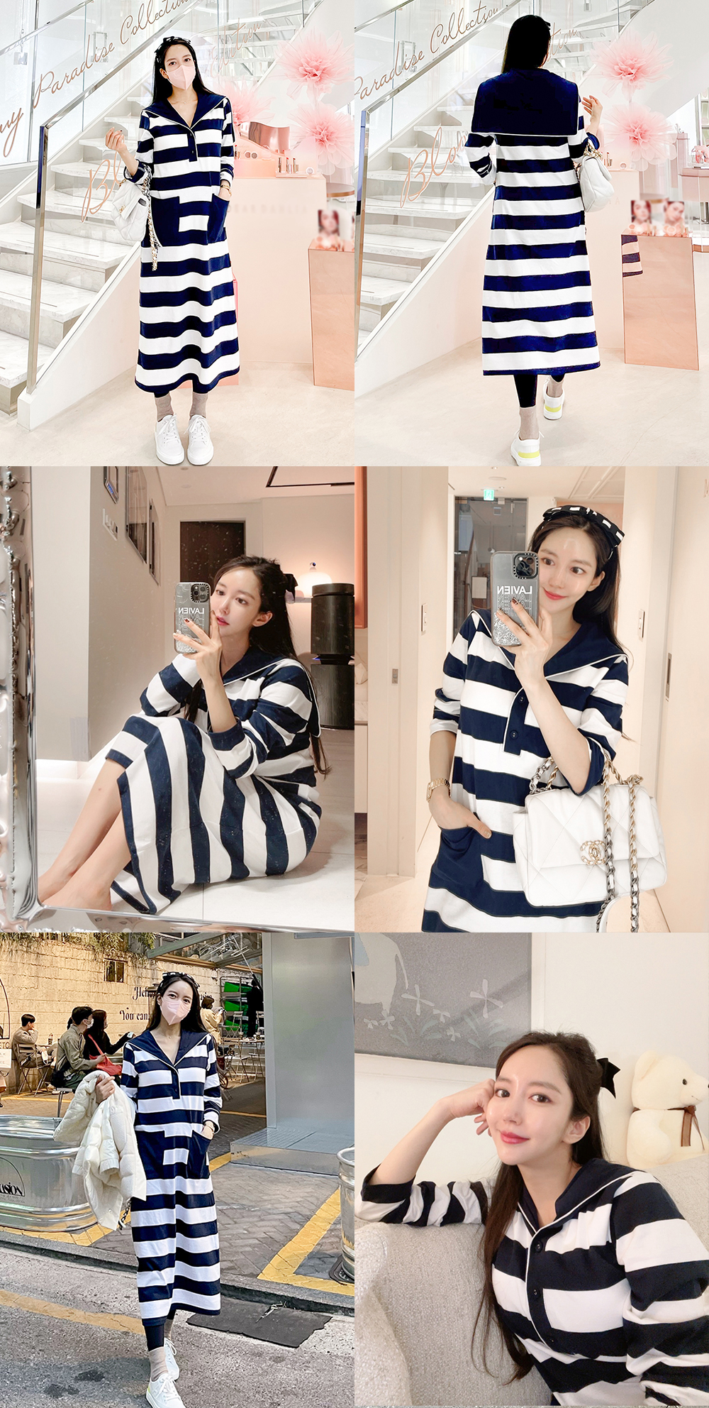 ネイビー×ホワイトのコントラストカラーのボーダーにセーラーカラーを取り入れたカジュアルワンピーススタイル。